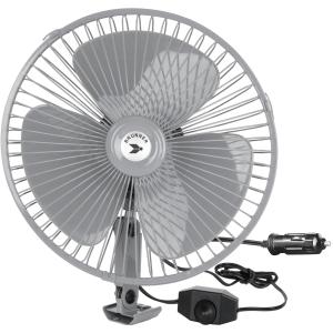Potente ventilatore a 12V con doppio sistema di fissaggio (piastra a vite o fissaggio a clip). Griglia di protezione cromata Ø 22cm. Collegamento elettrico tramite presa accendisigari.