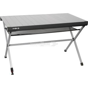 Tavolo in alluminio brevettato con ripiano arrotolabile e speciale telaio pieghevole di facile montaggio.