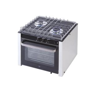 Cucina a gas con forno capienza 30 lt in acciaio inossidabile, provvista di piano cottura 2 fuochi in vetro nero temprato; comprensiva di kit di montaggio basculante. Fermapentole non incluso.