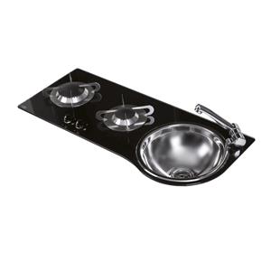 Piano cottura rettangolare ad incasso in vetro temperato antigraffio, alimentazione a gas a 2 fuochi con bruciatori A-SR, completo di lavello rotondo in inox con rubinetto montato direttamente sul piano in vetro. Sul piano è inserita una speciale bussola che è utilizzata come sede del ferma pentole a colonna.