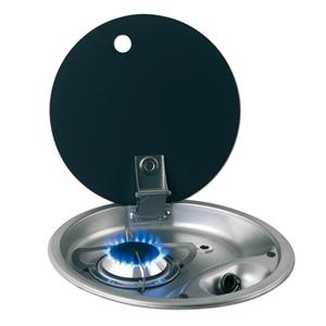 Piano cottura rotondo ad incasso, prodotto in acciaio inox, alimentazione a gas ad 1 fuoco con bruciatore provvisto di coperchietto autobloccante, griglia di supporto in inox fissata con gommini anti vibrazione. Coperchio in vetro nero temperato con cerniere a scomparsa.