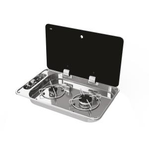 Piano cottura rettangolare ad incasso, prodotto in acciaio inox, alimentazione a gas a 2 fuochi, griglia di supporto in inox fissata con gommini anti vibrazione. Coperchio in vetro nero temperato con cerniere a scomparsa.